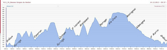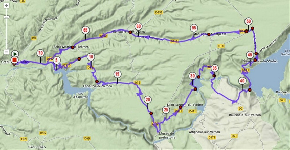 Bromes-Gréoux Les gorges ne sont donc pas accessibles pour un vélo de route et on ne peut que suivre le Verdon, le barrage et le lac d' Esparron, sur quelques petits kilomètres à la sortie de Gréoux puis sur les rives du lac de Quinson au pied de Montpezat. L'entrée des gorges de Baudinard correspond ensuite à la sortie des eaux du barrage du lac de ste Croix. On passe d'un point de rencontre avec le Verdon à un autre, par une série de montées et descentes à l'écart du cours dans un relief que j'avais sous-estimé: je l'avais à priori qualifié de "vallonné", mais en réalité il était vallonné à 8-9-10% jusqu'à ste Croix. |
